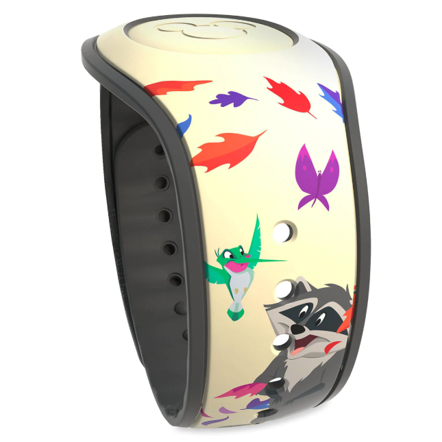 The other side of the band features her playful and devoted sidekicks, Flit and Meeko! Their smiles beam brightly as the wind surrounds them in painted leaves. This is an open edition MagicBand and retails for $24.99.