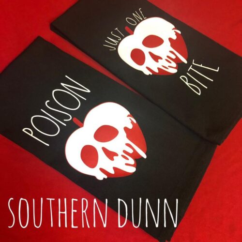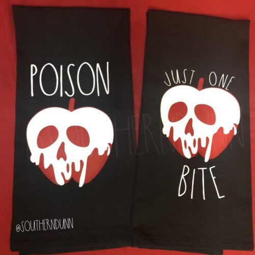 This adorable Poison Apple Disney inspired kitchen towel is great for your kitchen Halloween decor! Choose between Just One Bite or Poison! Or, get them both for the perfectly evil pair! This towel is 100% cotton, hemmed on all 4 sides, and features a loop for hanging.