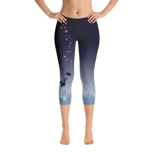 These splendid leggings feature a silhouette of Mary floating over London, with gentle blossoms trailing above. The leggings have a chic ombre coloring that mimics the night sky, and adds an extra pop of contrast to Mary and the flowers. This print is available in capris length, ankle length, and yoga pant styles. Each pair is printed, precision cut, and then hand sewn, for a practically perfect pair every time. You can also get the Mary Poppins sneakers that match for a truly supercalifragilisticexpialidocious ensemble!