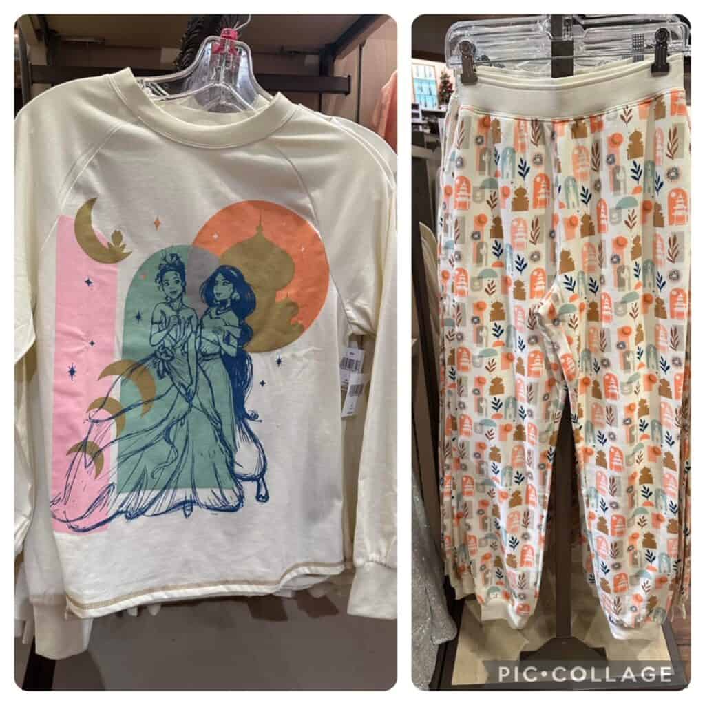 The pretty as a peach princess collection also includes a long sleeve t-shirt and pants. Doesn’t this look like the epitome of comfort? Color me cozy wearing this outfit! The tee combines unlikely Princesses Tiana and Jasmine together. However, the abstract artwork of Arabian architecture, moons and stars draw the princesses together with a beautiful connection.