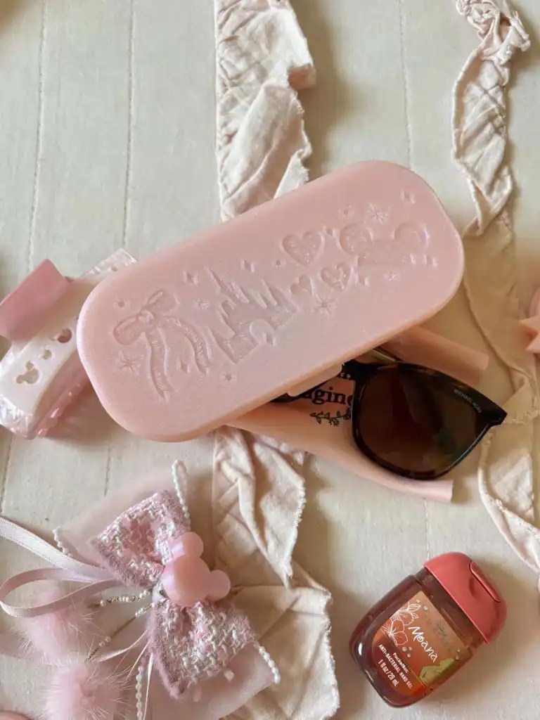 The first option is a coquette-style case. It has the classic bow associated with the coquette style, surrounded by hearts and pixy dust. The castle and a set of mouse ears dance around playfully on the front of the case to complete the look.