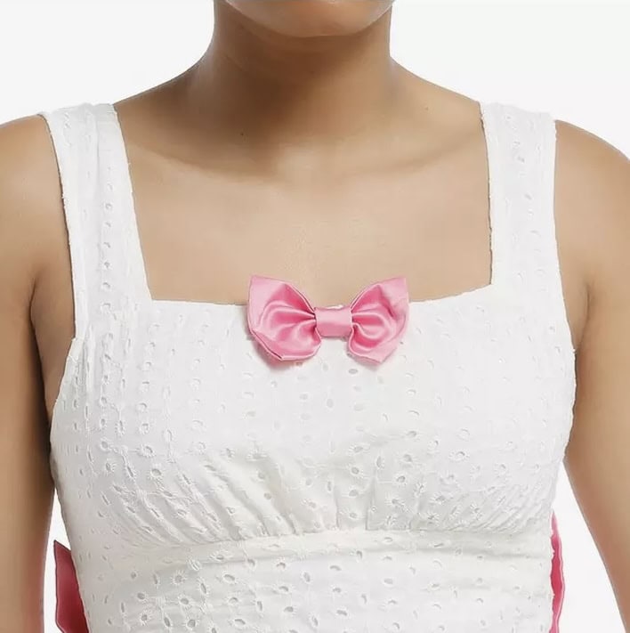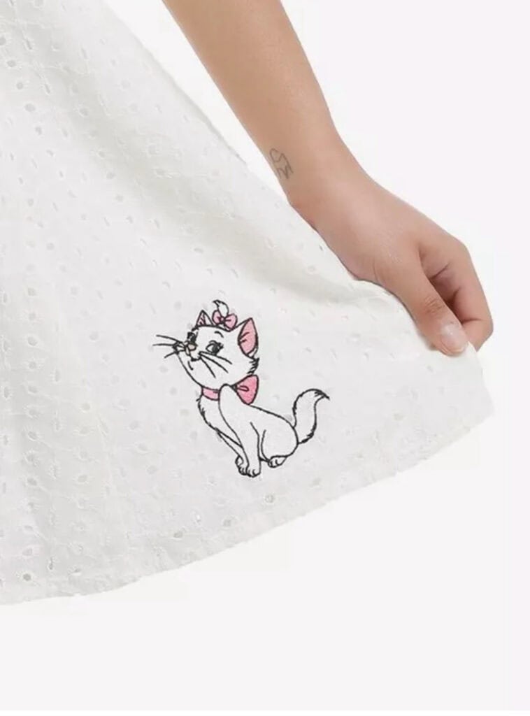 Marie sits perched on the bottom corner of the dress’ skirt. Albeit small, it’s just the right size of design for this dress. She wears her iconic pink pow on the embroidery and shares it with you as well! The neckline is accentuated with a pink bow at the chest and a matching removable bow on the back. I just love a large oversize bow at the waist of a dress! Yes, the dress has pockets!