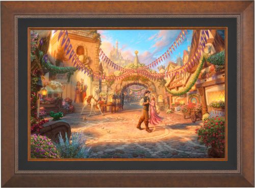 “Rapunzel Dancing in the Sunlit Courtyard” is the sixth and final artwork in the “Dancing in the Light” series from the Thomas Kinkade Studios Disney Dreams Collection. Each painting features favorite Disney Princesses dancing with their Princes. The other titles in the collection include “Beauty and the Beast Dancing in the Moonlight”, “Cinderella Dancing in the Starlight”, “Snow White Dancing in the Sunlight”, “Sleeping Beauty Dancing in the Enchanted Light”, and “Jasmine Dancing in the Desert Sunset”.