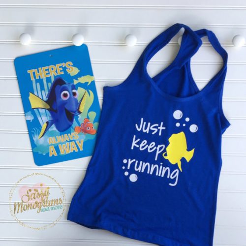 The Just Keep Running racerback tank top is inspired by Dory from Disney Pixar’s Finding Nemo. Dory’s motto is to “just keep swimming” and your own motto can be to “just keep running.”