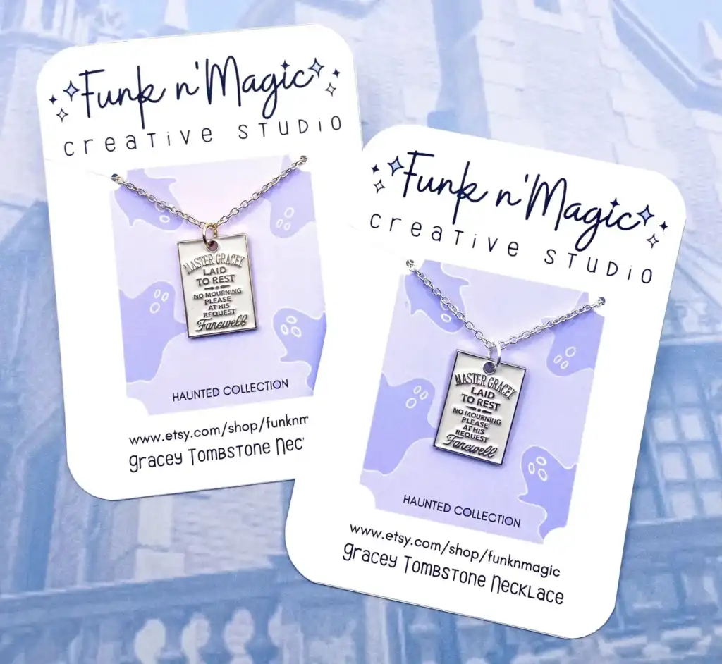 Finally, we cannot move to the great beyond without mentioning Master Gracey! “Master Gracey laid to rest. No mourning please at his request.” You can keep a piece of the Haunted Mansion with you until you’re able to “hurry back” when you wear this necklace.