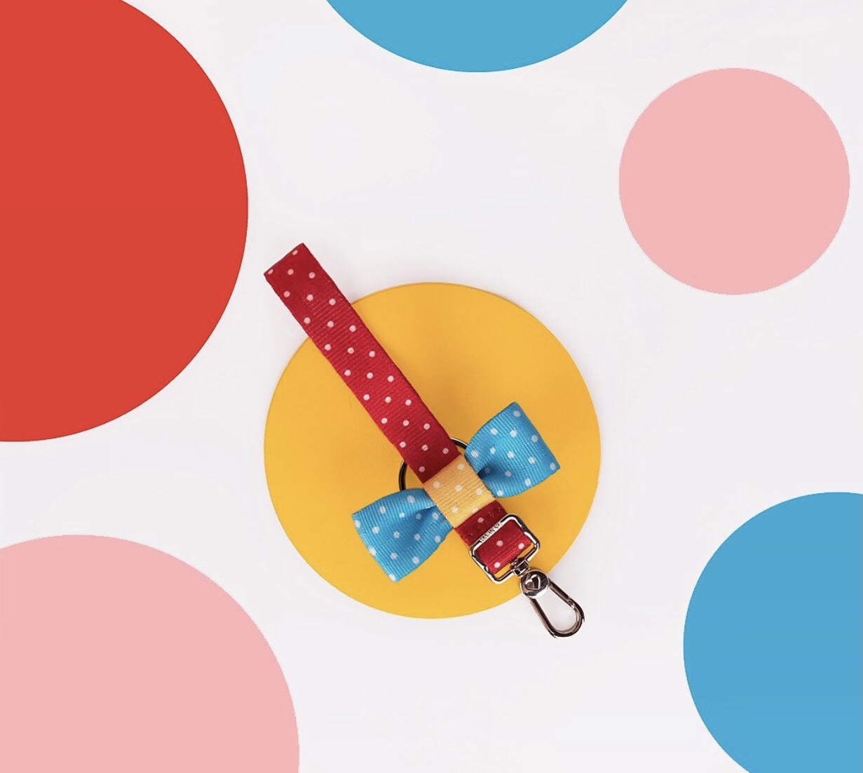 There is a red stripe with small white polka-dots (classic Minnie), a sky blue strip with large white polka dots (vintage Minnie), a yellow strip with small white polka dots (fun Minnie), and a baby pink strip with medium white polka dots (sweet Minnie). It’s one of those designs that should not work, but actually works so incredibly well! The handle of the bag is a matching sky blue and it features a Minnie Mouse charm as well.