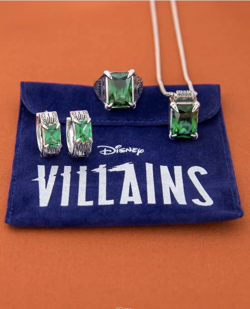 The jewelry captures every bit of that energy. Choose from the Sinister Scar Necklace, Earrings, or Ring, each piece a bold tribute to the villain’s commanding presence. A brilliant green crystal takes center stage, symbolizing Scar’s piercing gaze and dangerous allure. Surrounding the gem are etched details of his fiery mane and carvings inspired by indigenous designs from the Savanna. The collection blends character, culture, and villainous elegance into one unforgettable look.