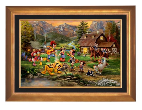 Notice how the painting catches the beautiful sunset against the picturesque Rocky Mountains. You get the feeling of a fall evening with the warmth of the bonfire and the warm hues of the colors. From the stream trailing the mountains to the pond in the foreground, you can almost hear the sound of the water. Speaking of sounds, sing along and kick up your heels with Goofy and Mickey as they strum out some festive tunes.
