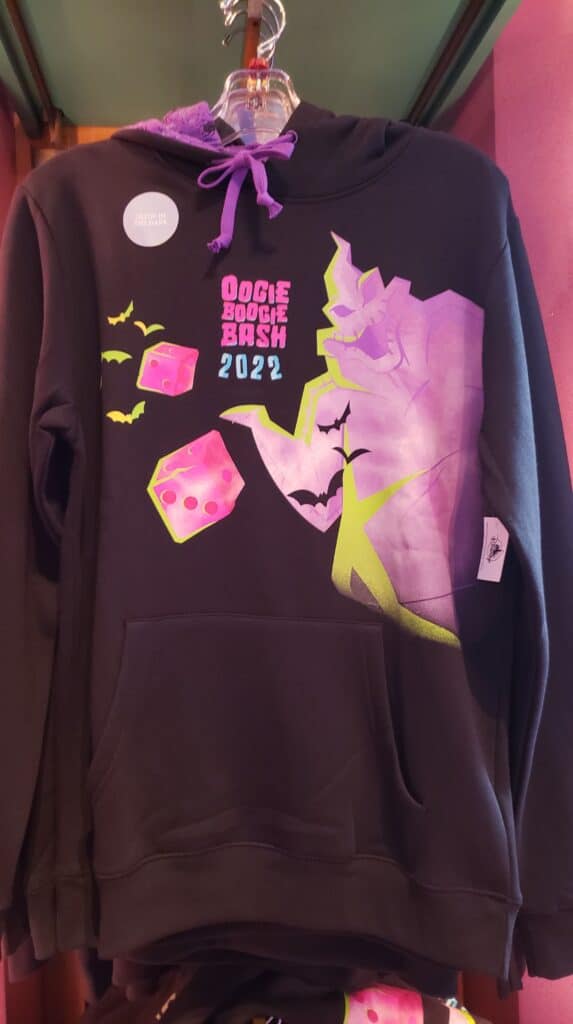 First up is this Oogie Boogie Bash hooded sweatshirt. Listen, I know that California is in a heat wave right now, but eventually, the temperatures will drop, and you will want to curl up in this cozy style. Oogie Boogie is rolling the dice and inviting you to a tempting game of chance on this design.
