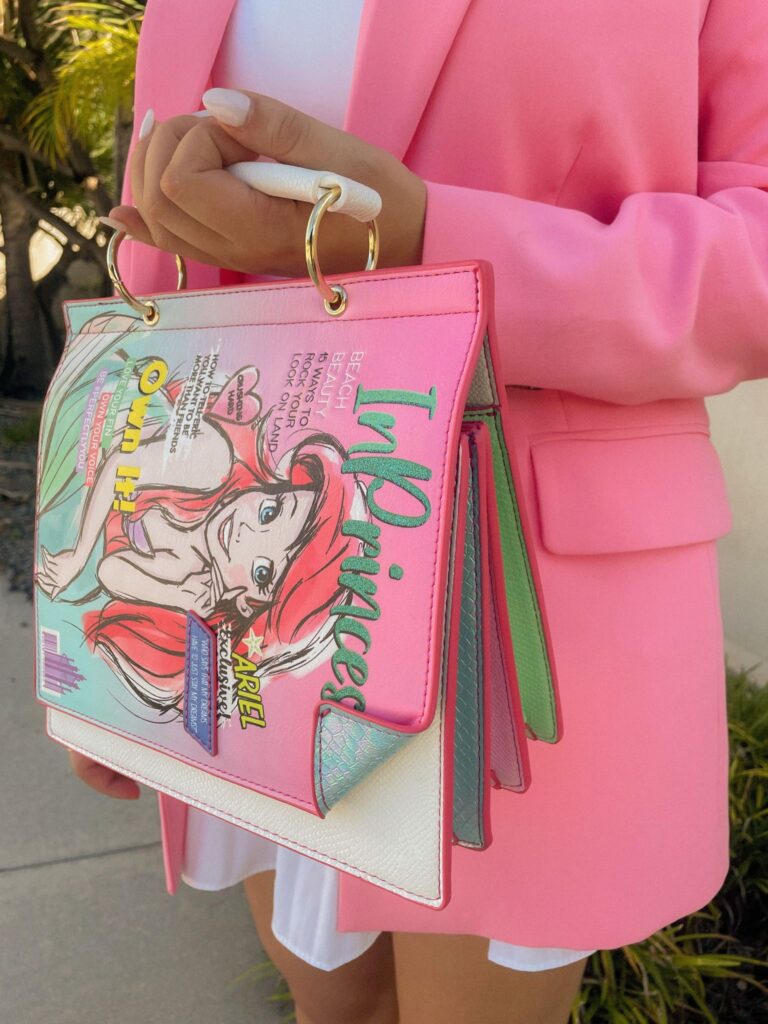 The interior of this bag is awesome – it has three sections (even mermaids like to keep an organized purse)! The background of the magazine front flap is pink and the sides are iridescent pink, blue, and green – and the gold hardware and white body of the bag really help the colorful accents stand out! I love the detail of the iridescent blue on the underside of the front flat – it coordinates with the sides and is embossed to look like scales. So appropriate for a mermaid, right? This bag would be perfect for a day at Magic Kingdom. I think it would be the perfect accessory for a ride on Under the Sea Journey of the Little Mermaid!
