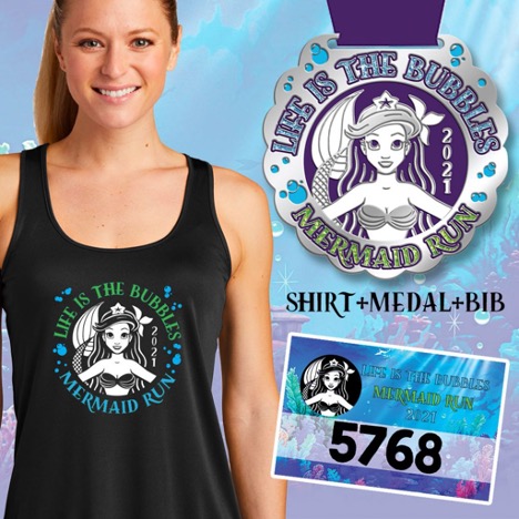 All finishers receive a Mermaid Run shirt, medal, and race bib with their number on it. All three have a Swim-sational logo with a beautiful mermaid floating amongst the bubbles. You get to choose your shirt color!