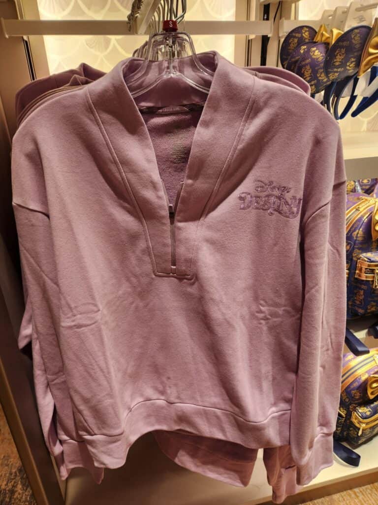The last three pieces are a soft lavender color. One of the fashionistas has mentioned how perfectly the shade matches the Disney Loves Lilly collections! Choose from 3 different styles, including a V-neck 3/4 zip, crewneck sweatshirt, and a flutter sleeve, short sleeve shirt.