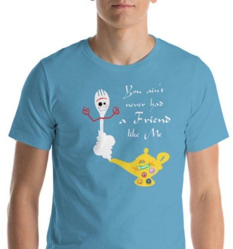The shirt features Genie’s iconic words “You ain’t never had a Friend like Me” along with the image of Forky coming out of Genie’s Lamp in a cloud of smoke. It also looks like Bonnie has gotten her hands on the lamp since it has been adorned with stickers.