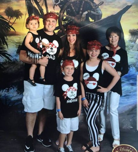 These matching Mickey and Minnie pirate shirts are perfect for the cruising couple. I just love that Minnie’s eye-patch is a heart! How very chic of her! Not only are these Mickey and Minnie pirate shirts great for couples, but they are also great for the whole family. As you can see from teh picture, these shirts can be customized for each family member to include their name. The family that cruises together, stays together!