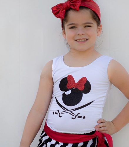 Each design is available in a whole range of different sizes. I’m loving this little model’s style! She’s got her Minnie Mouse pirate tank top and has pulled the look together with a black and white striped skirt and coordinating red headband. This pint-sized pirate is my Disney Cruise #StyleGoals.