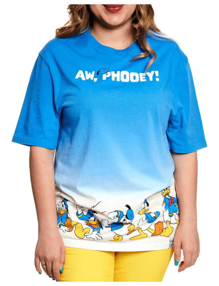 In addition to the amazing Donald accessories, there are also two pieces of clothing. The first is the Aw Phooey Tee. Donald dances around the bottom of this ombre tee. He looks a little angry and as though he has much better things to do than stand on a tee shirt all day. The fact that the word Phooey has a hat makes this tee even more spectacular.