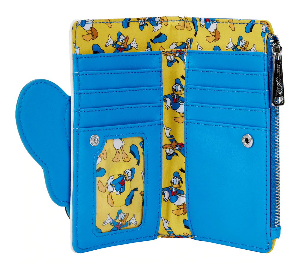 Open the wallet up to see Donald posing for the camera. I find angry Donald so funny! His hat can be seen flying all around him. There are four card slots on either side and one clear ID slot.