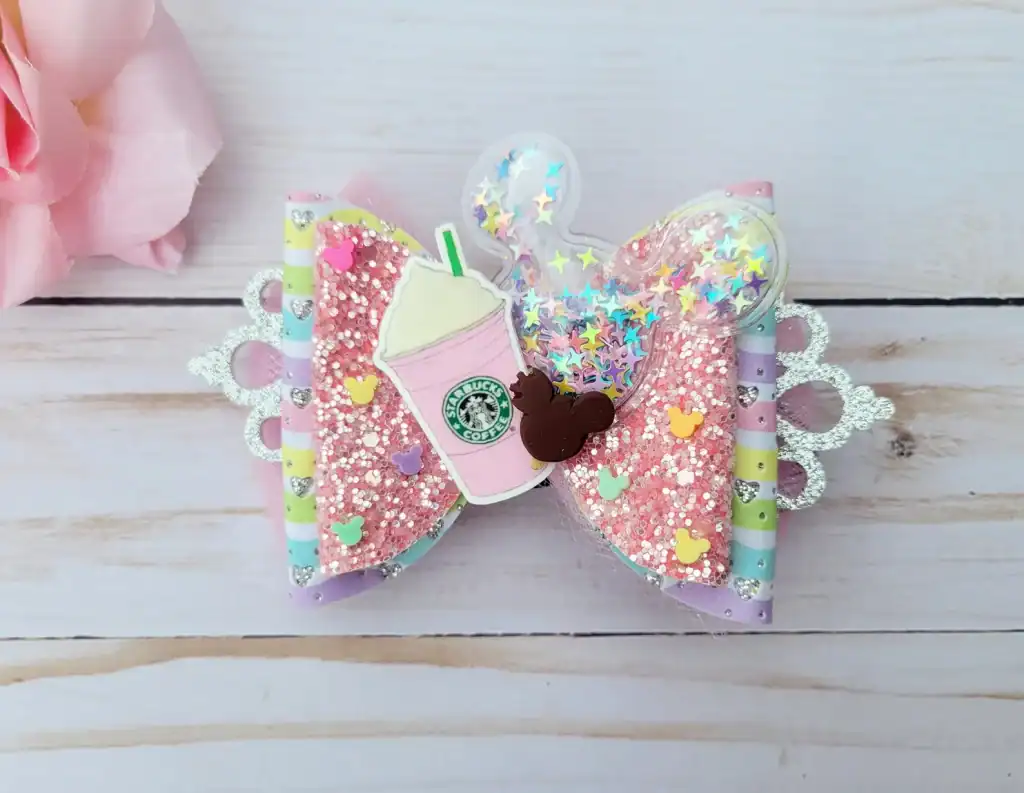First, let’s kick things off with a little dose of sugar, shall we? This cute bow is perfect for all the Disney fashionistas who love Starbucks and style. It is available as an alligator clip, black hair tie, satin-lined headband, or stretchy nylon headband and measures approximately 4″ wide by 3″ tall. I love the pop of pastel colors, the glitter, and of course, the shakeable confetti Mickey Mouse head!