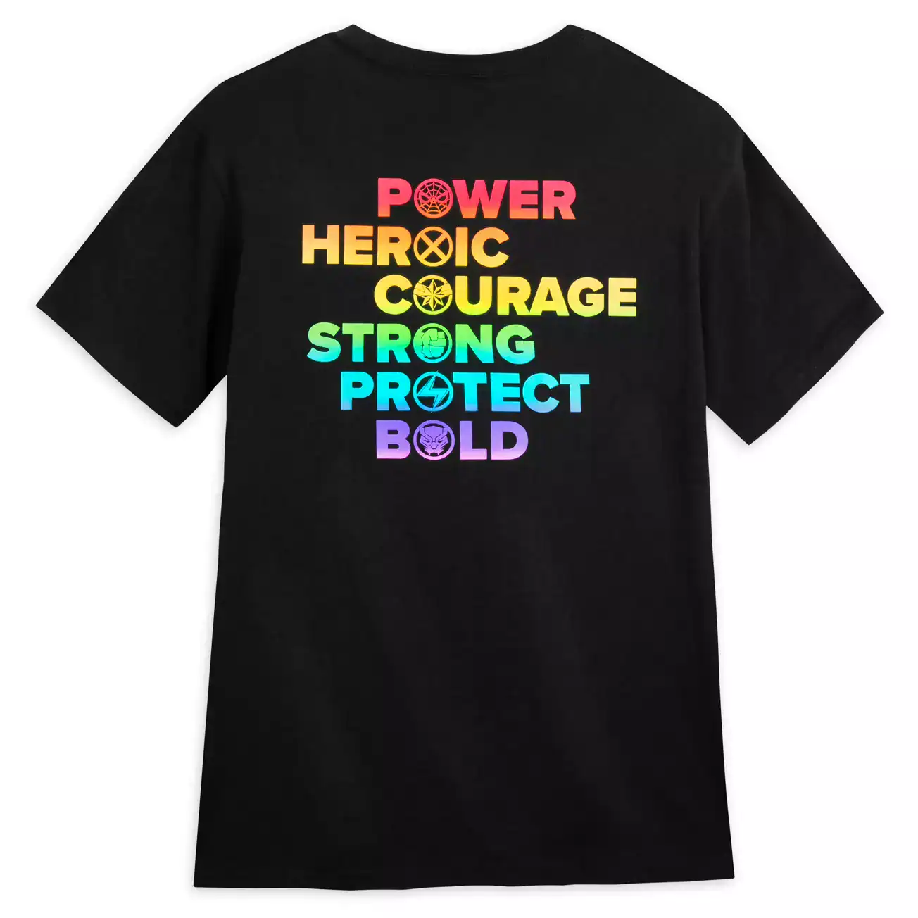Marvel Pride Collection T-Shirt for Adults: $29.99. This style features screen art on both sides. It has the Marvel logo in rainbow colors on the front, while the back has ”Power. Heroic. Courage. Strong. Protect. Bold” text in rainbow colors.