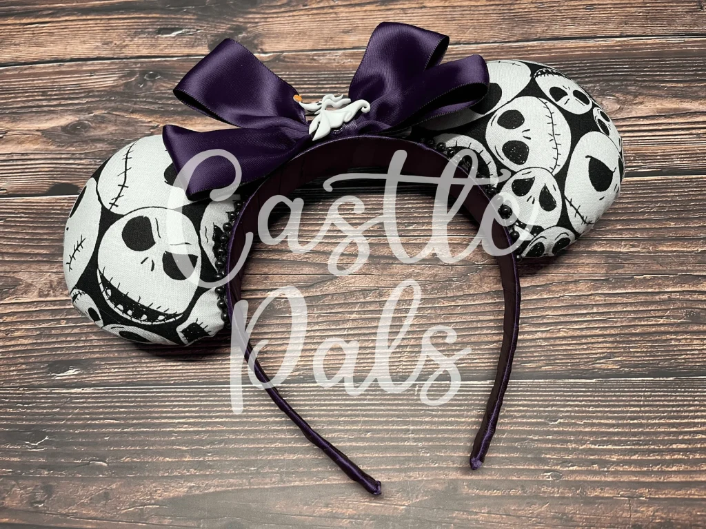 Show your love for the many expressions of Jack Skellington when you wear these ears! Inspired by The Nightmare Before Christmas, Jack Skellington covers the ears while Zero flies onto the center of the purple bow.