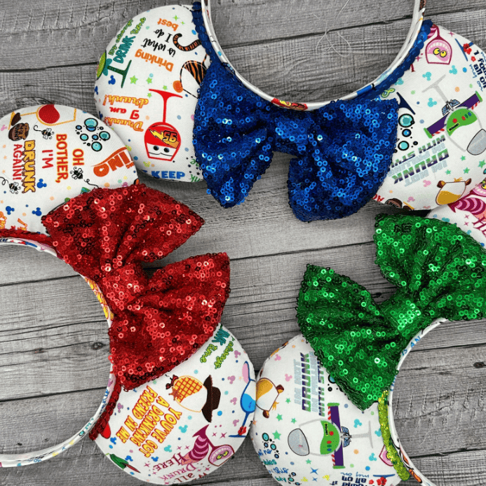 Each ear is covered in a vibrant fabric featuring playful wine glass designs inspired by some of our favorite Disney characters. You’ll spot nods to Toy Story, Cars, Monsters Inc., and more—all cleverly reimagined as whimsical wine glasses. The bold sequin bows (available in red, green, or blue) add that perfect pop of shimmer to match your park outfit.