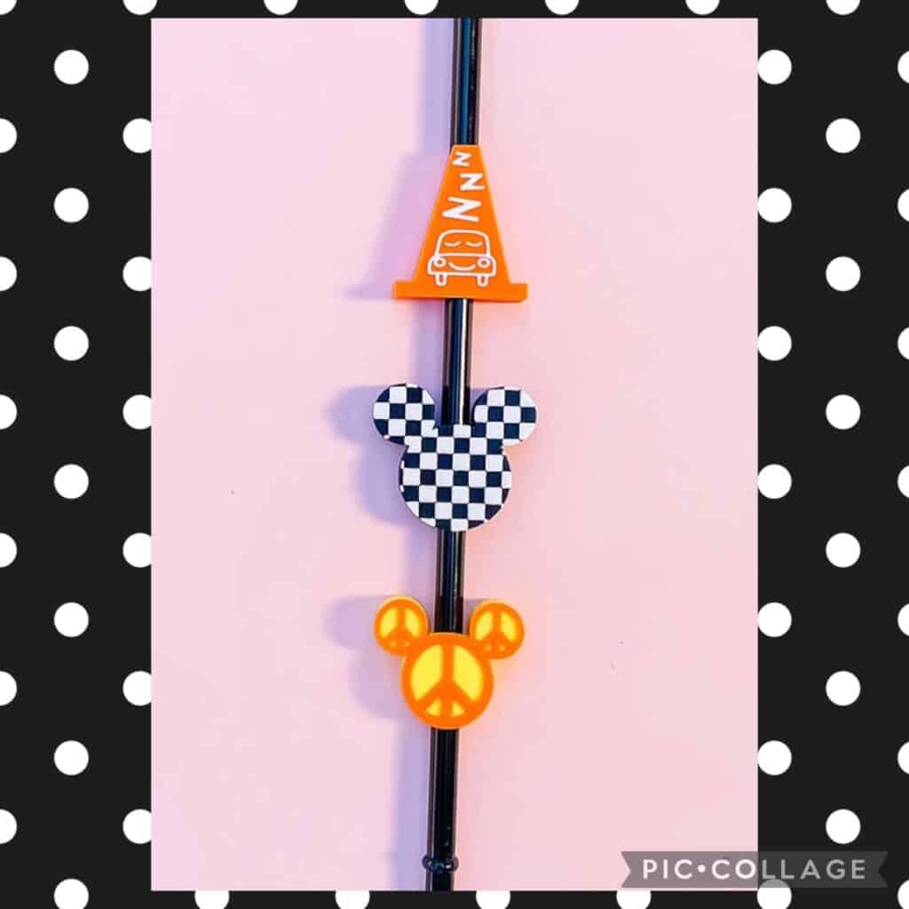 Next, we have the peace sign, traffic cone and checkerboard mickey straw topper. I love this trio together. Can you hear the rubber burning on the track? It’s perfect for you Cars aficionados! Zoom Zoom!
