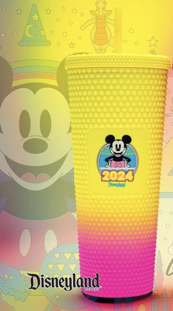 Hemos recibido un vistazo de lo que se viene de Starbucks y Disney para comenzar el 2024 y la verdad es que es brillante, pero literalmente brillante en estos colores rosa fosforescente, amarillo y azul cyan. En ellos vemos a Mickey Mouse en colores fosforescentes y el año debajo, con versiones de Walt Disney World y Disneyland.