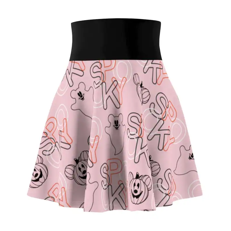 If you love everything about spooky season, this is the skirt for you! Mickey Ghosts and Mickey Pumpkins are featured throughout the design along with Spooky lettering. Plus, it’s pink!
