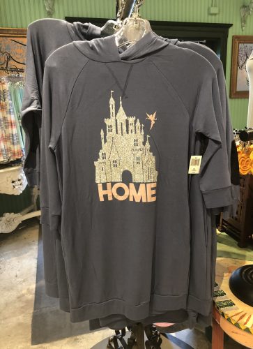 Sometimes you just need a really awesome hoodie, and there are two options in this collection that fill that role. They both feature the castle, but each one has a unique look. The first has the castle made of rhinestones with a Mickey Mouse silhouette in the center. It is $69.99. The bottom one has a more detailed castle made of silver glitter. The finishing touches are a rose gold Tinkerbell and the word Home. It retails for $59.99