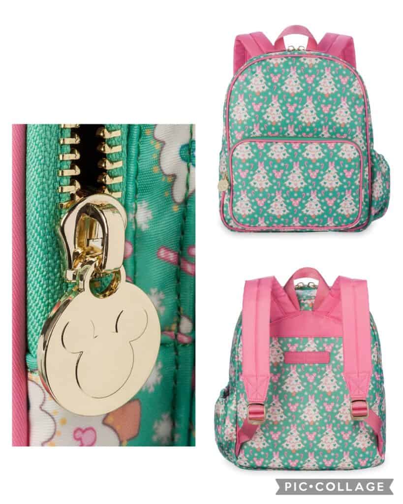 Be transported into a Holiday Wonderland with the newest addition to the Disney x Stoney Clover Collaboration. Dainty white trees complete the bag with mint green and pink Mickey head ornaments. I love the softness in the colors of this bag. Instead of evergreen and red, you have mint green and pink! Peppermint Mickeys, Snowflakes and Dancing Candy canes fill the space around the Christmas trees. The backpack boasts gold hardware, stamped with Mickey, of course. Also pink piping around the corners of the bag. There’s plenty of storage space for school , work or play with two exterior pockets.