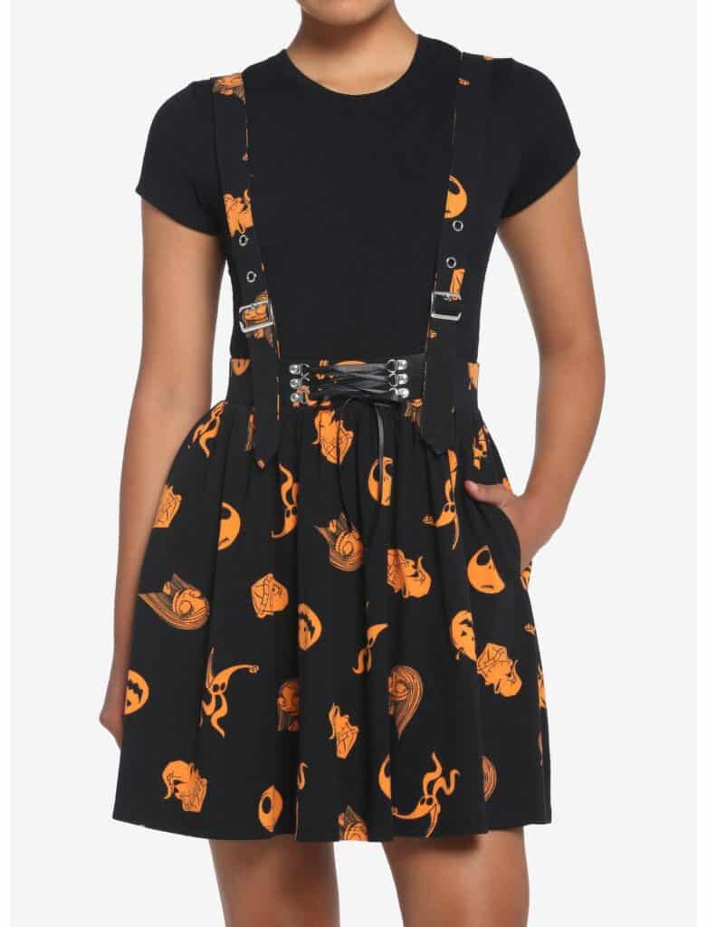 A Hot Topic classic silhouette in a new pattern – this suspender skirt features orange fan favorite characters in a toss pattern over a black background. The lace up detail at the waist makes this skirt super unique!