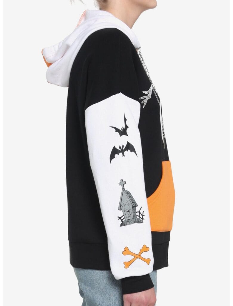 Everyone will scream for this new NBC Colorblock Hoodie. The orange, black and white color blocking truly embodies Jack’s favorite holiday! The Pumpkin King himself alongside loyal Zero is featured on the front. In addition, this hoodie has fun sleeve details – bats, bones, Zero’s house, and “The Pumpkin King” are printed on each side.
