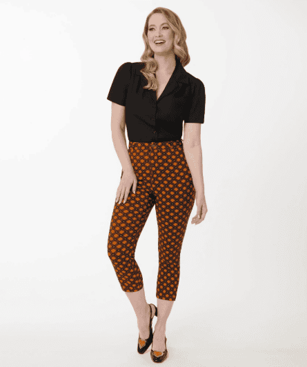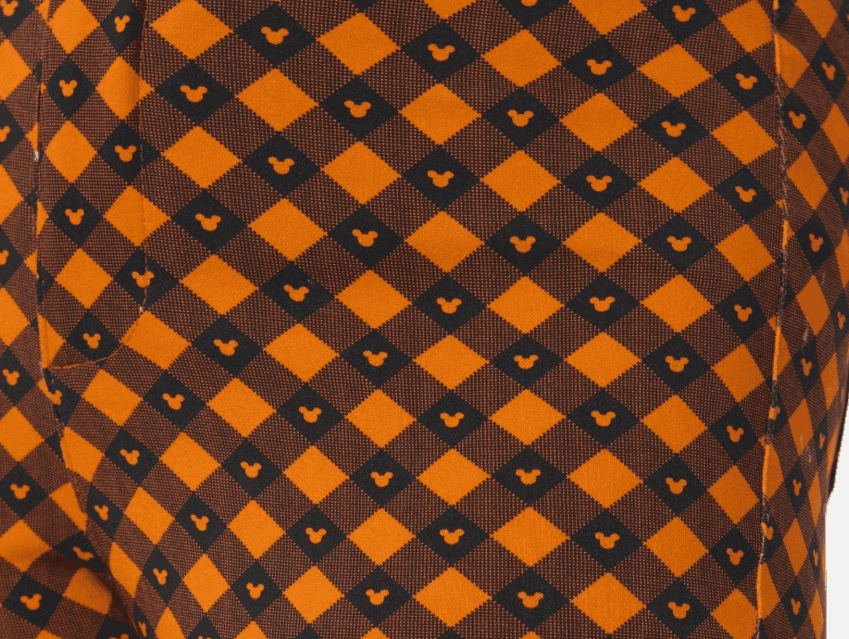 The bold orange-and-black gingham print is scattered with tiny Mickey silhouettes—retro, festive, and fabulous. Made from a comfy, slightly stretchy woven fabric, they feature a front zipper, button closure, and handy back pockets. These pants are made for both style and function!