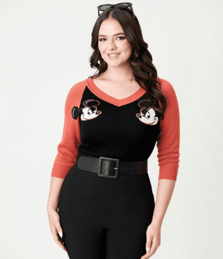 This cozy knit features bold orange raglan sleeves and classic Mickey head details against a sleek black base. It’s a playful, seasonal twist on a fall staple! Plus, it will pair perfectly with jeans, skirts, or even layered over a dress for cooler nights.