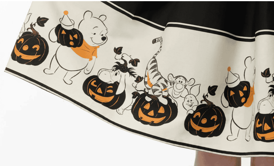 Add a touch of Hundred Acre Wood charm with the Winnie the Pooh Halloween Pumpkin Print Cotton Swing Dress from Unique Vintage. This whimsical 1950s-inspired swing silhouette features darling border prints of Winnie the Pooh, Tigger, Eeyore, and Piglet, and jack-o’-lanterns dancing across a chic black-and-ivory canvas.