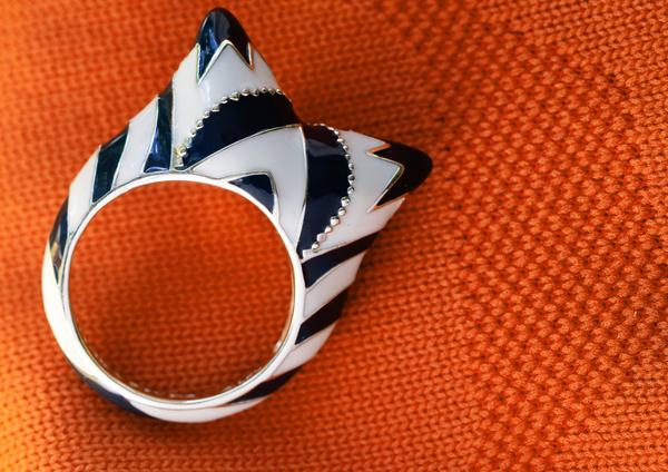 A very special piece of this collection is the Ahsoka Tano Ring. The ring is inspired by Ahsoka Tano from Star Wars: The Clone Wars, who is voiced by Ashley Eckstein. Ashley Eckstein is the creator of Her Universe and a total fan favorite of ours here at Disney Fashionista. Ahsoka’s iconic montrals are sculpted in solid sterling silver, and then fully finished in smooth alternating patterns of grey-blue and white hand-painted premium enamel. Engraved within the band are the words AHSOKA LIVES, which actually brings tears to my eyes when I read it. Ahsoka was a superior warrior and Jedi Padawan, her character in the Clone Wars was inspiring, and even my young son idolizes her.