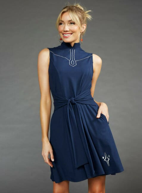 Channel the Force with galactic style! Inspired by Ahsoka Tano, this blue dress features a mock neck with a design across her chest modeled after her outfit in the final season of Clone Wars. Comes with tie-front detailing at the waist, side seam pockets and her Fulcrum logo embroidered at the hem. Complete with a keyhole closure behind the neck.