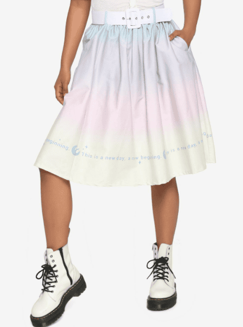 Get ready for a new day in this skirt from Star Wars featuring a pastel ombré color scheme with the Rebel insignia and “This is a new day, a new beginning” repeated along the bottom and a removable belt.
