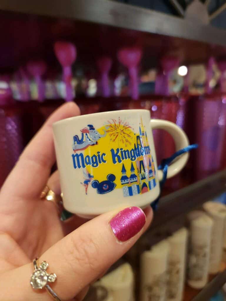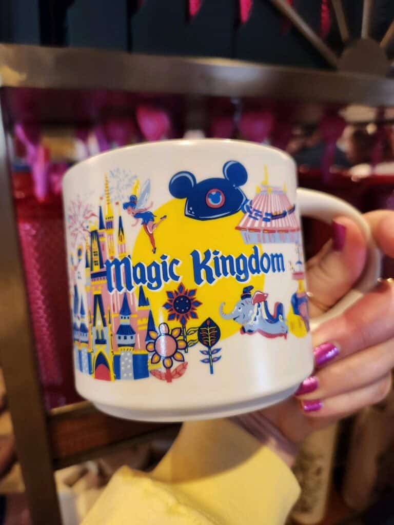 Next, take a trip down Main Street. It’s true everything tastes and smells better on Main Street, USA. Dream of the confectionery as you sip your coffee from the Magic Kingdom coffee mug. This mug features Cinderella Castle, the carousel, Dumbo, Space Mountain and more. Tinker Bell even helps out with the fireworks above the castle!