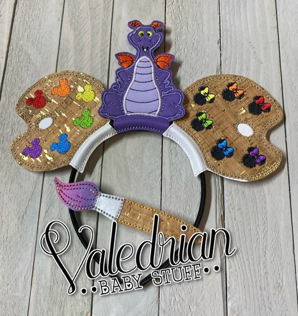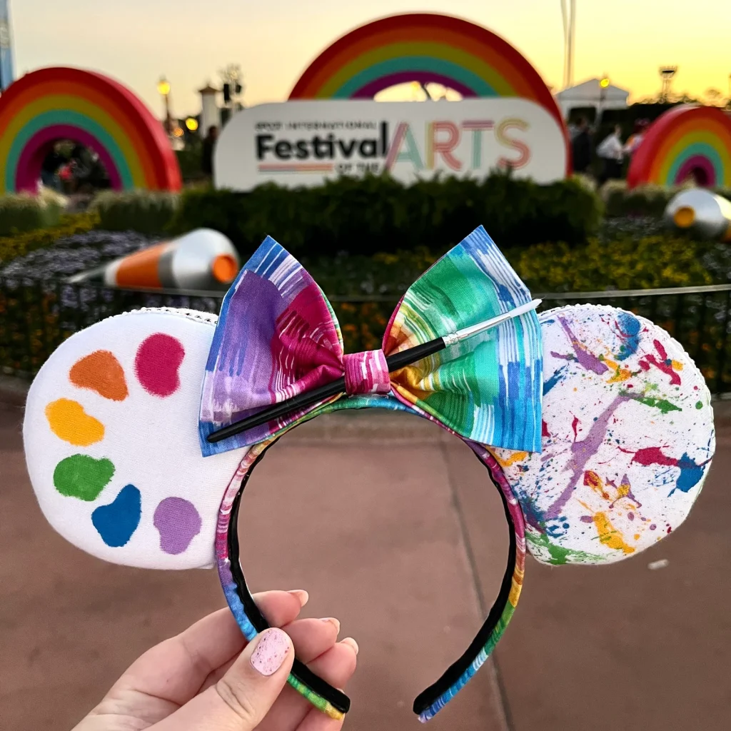 These EPCOT inspired ears are perfect for a day at the festival! The ears feature white fabric with hand painted splatter on one ear and an artist palette on the other ear. Then, they are finished with a rainbow iridescent trim and abstract bow. You can find them on Etsy from SewMagicallyYou.