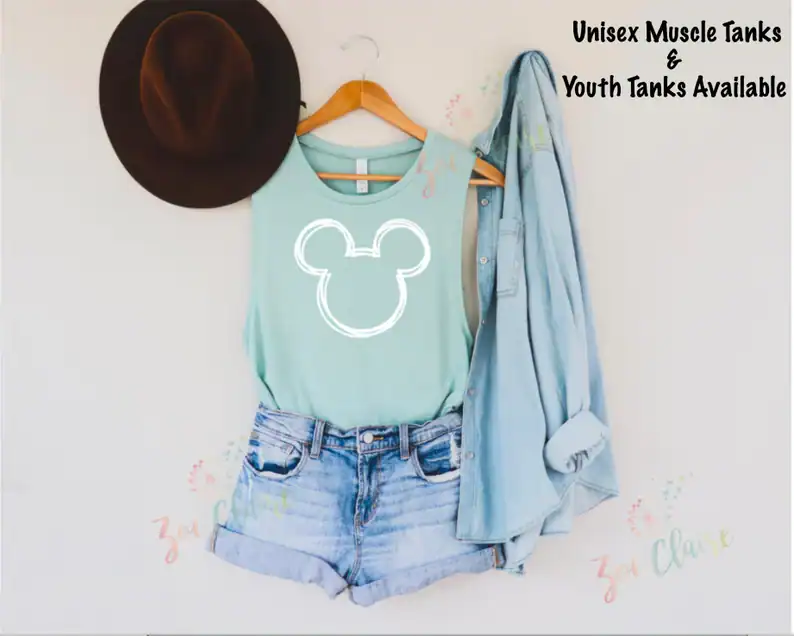 When you are ready to put together the easiest Disney outfit ever, this is the tank top you need! The beautiful seafoam color is perfect for summer. Plus, you can never go wrong with a classic and simple Mickey Mouse design. You can find this tank top (available in several different color options) on Etsy from ZoeClaireCreations.