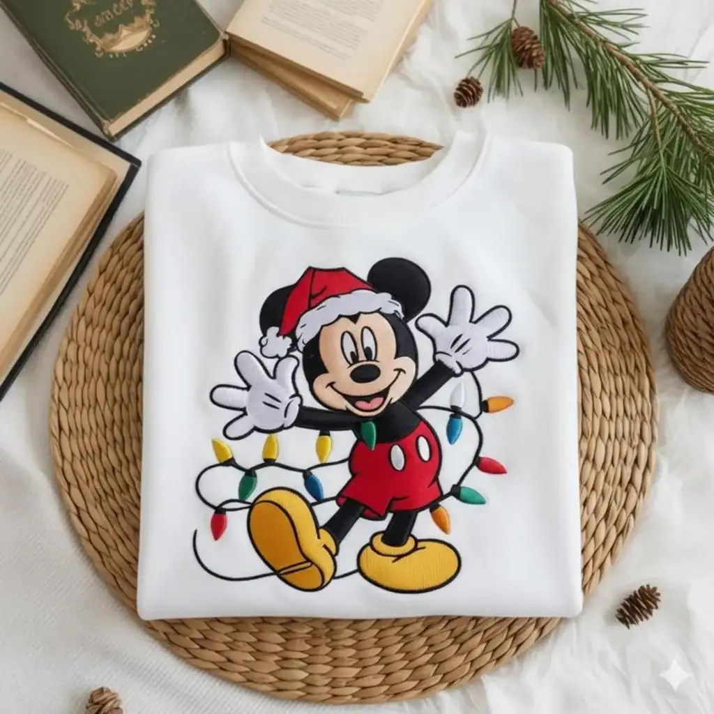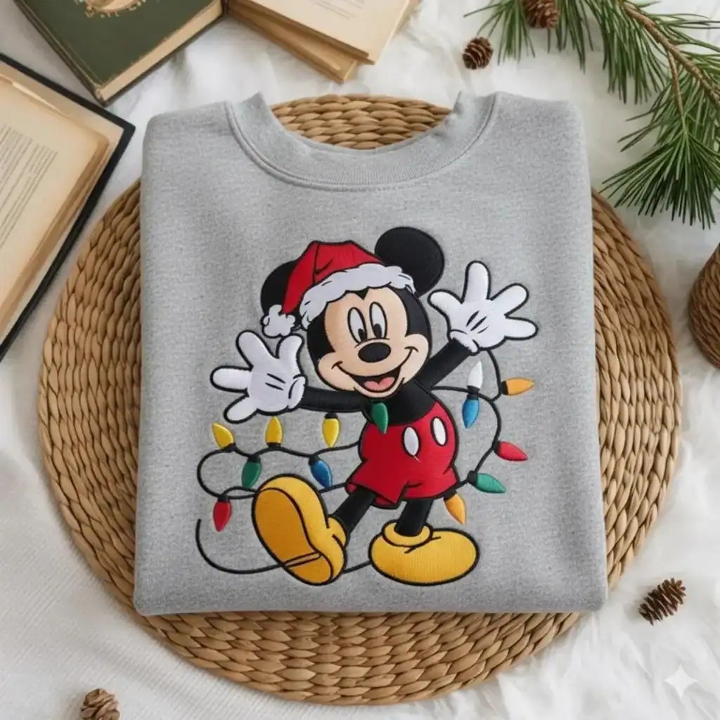 If you want to add cozy charm and classic Disney magic to your holiday wardrobe, this embroidered Mickey Mouse Christmas sweatshirt from WildcraftedwondStore on Etsy is a perfect pick. The design features Mickey at his most festive, wrapped in colorful Christmas lights and wearing a cheerful Santa hat. The look is joyful, bright, and ready to make every holiday moment feel a little more magical.