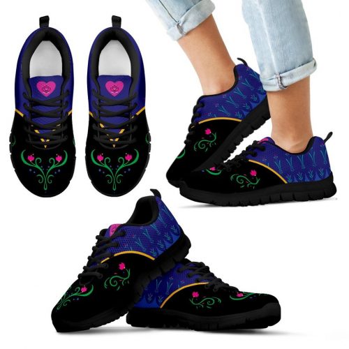 It’s Coronation Day for your feet with these beautiful new shoes! These gorgeous sneakers are designed to mimic the pattern of Ann’a dress, and are available in women’s and kid’s sizes. The shoes are tipped in a sleek black, with green and pink Rosemåling. A gold strip separates the black from the sapphire blue that has a lighter blue Rosemåling inspired print. The tongue of the shoe has a pink heart, because a sister’s love is always true!