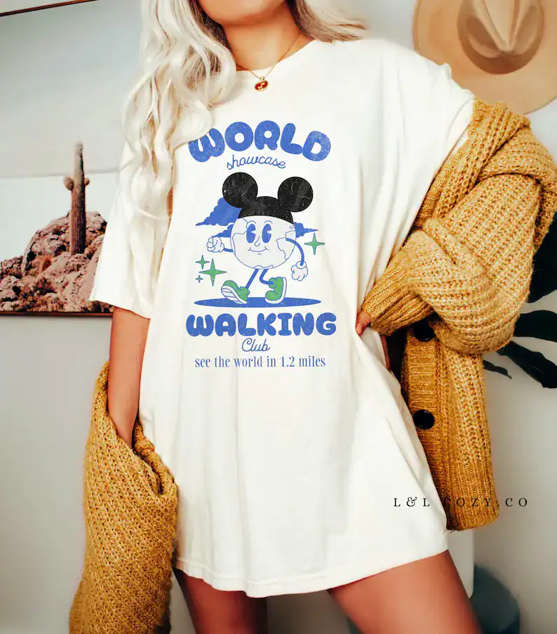 Step up your style and show off your Disney side with this World Showcase Walking Club T-Shirt from LandLCozyCo on Etsy. With the softness, relaxed fit, and muted color palette, this shirt is perfect for any laid-back Disney Fashionista.