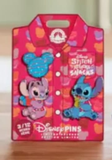 As with the preceding Stitch Attacks Snacks releases, you can also find a Macaron themed, limited edition pin set. The trio of pins includes individuals of Stitch, Angel, and the tasty treat itself. They’re adorably displayed on a Hawaiian shirt.