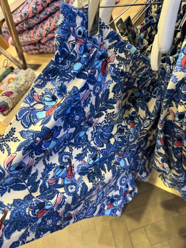 Accessories round out the collection beautifully. Smaller zip pouches are perfect for organization, whether you’re tossing them into a park bag or using them on their own. The collection also includes a coordinating plush throw blanket featuring Stitch in the Leafy Blooms design. It looks incredibly soft and cozy, making it a great choice for movie nights at home or as a thoughtful gift. Of course, you can’t have a collection without some sort of PJs or loungewear. We have fabulous loungewear in this collection!