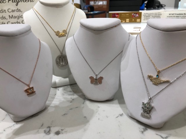 Annual Passholders also get a special design! A gold toned jewel encrusted Mick Mouse ear hat showcases an “Annual Passholder” Mickey logo. The Annual Passholder necklace is the same price as the it’s a small world pendant for $125.00.