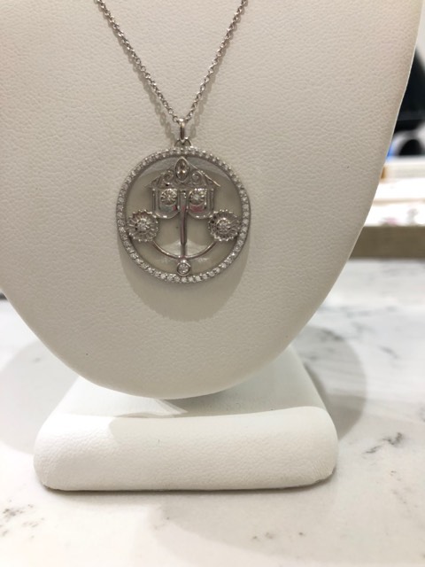 We get a touch of Aladdin in this fun assortment with a beautiful gold Genie Lamp. The top of the lamp is accented by a teal jewel that reminds me of the one worn in Jasmine’s crown. Also available is a Carousel Horse necklace! This is a silver pendant with just the right about of gems to add sparkle! Both pieces are available for $100.00 a piece.
