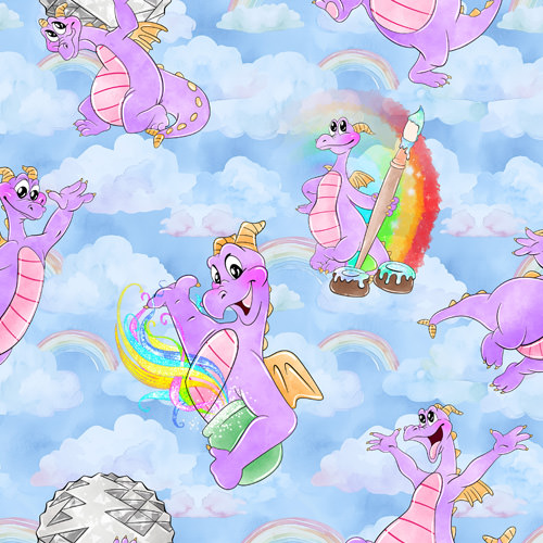 Figment is so stinking cute; I just can’t stand it! Look at that sweet little face. The print Imagine with Figment features the creative creature painting rainbows and makes a great option for the Festival of the Arts! Geometric Figment showcases his smiling face centered in diamond shapes. I love the added touch of Spaceship Earth at the connection points.