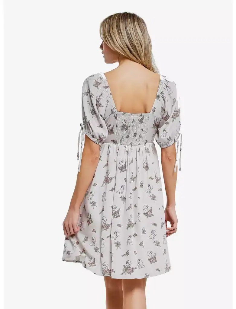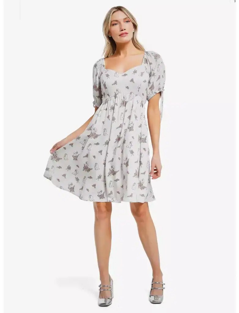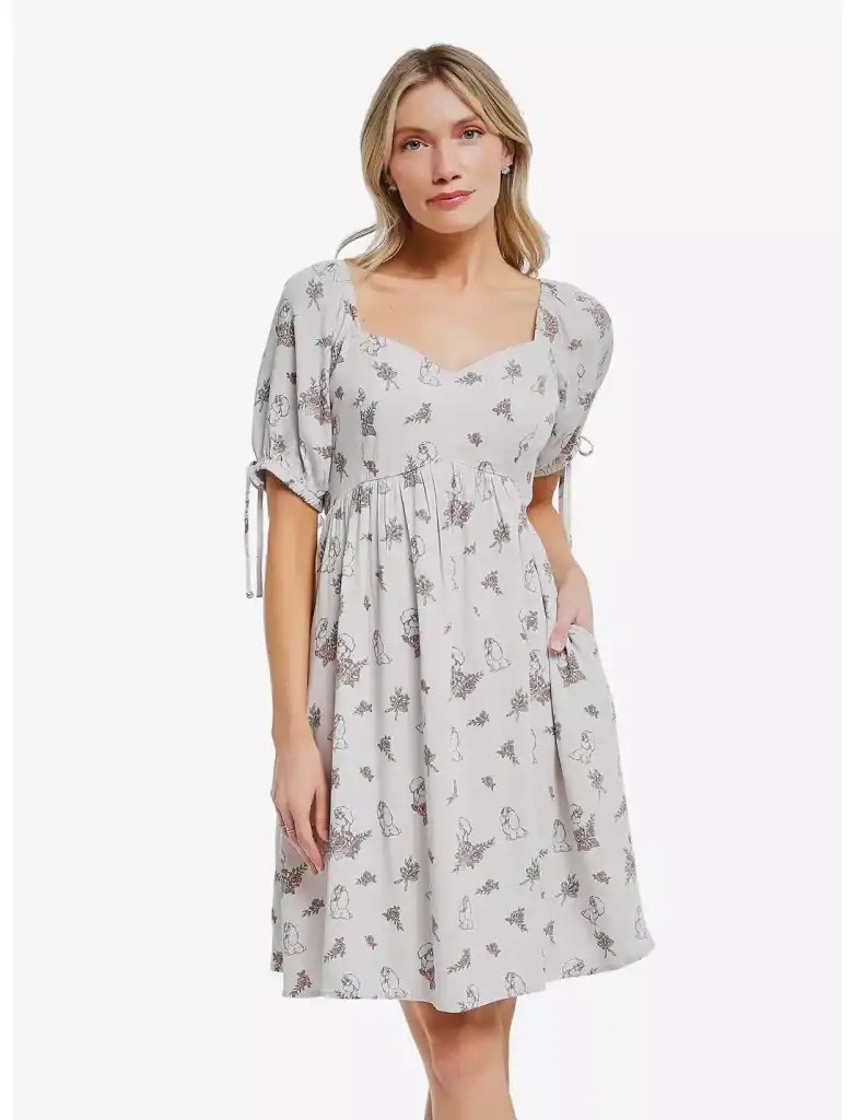 Get dressed up for a “bella notte” with this Lady and the Tramp-inspired dress! Featuring an allover print of Lady and flowers, this dress includes pockets, a sweetheart neckline, and puff sleeves. I am loving this light grey color and I think it’s the perfect neutral for spring. You can keep it neutral or pair it with pops of color to change up the look.